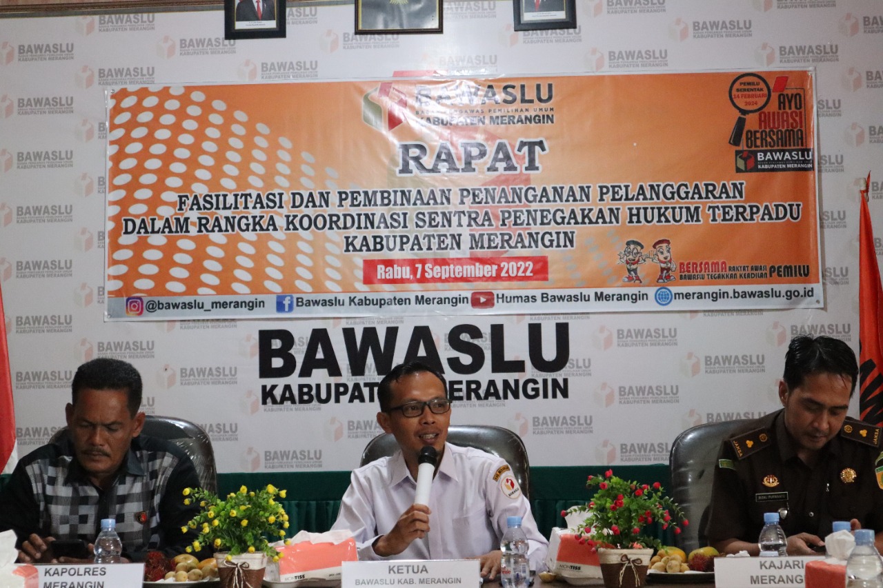 Ketua Bawaslu Merangin mengatakan menurut arahan ketua Bawaslu RI bahwa Sentra Penegakkan Hukum Terpadu (Gakkumdu) Kabupaten/Kota akan mulai bertugas terhitung tanggal 1 September 2022. Hal tersebut disampaikan pada rapat perdana Sentra Gakkumdu Kabupaten Merangin pada, Rabu 7/9/2022.