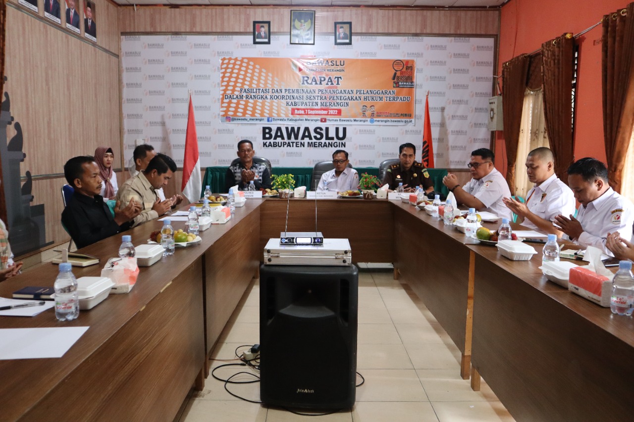 Rapat yang dibuka oleh Ketua Bawaslu Kabupaten Merangin Alber Trisman menyampaikan “Rapat Gakkumdu dilaksanakan pada hari ini, setelah Kapolres Merangin dan Kejari mengirimkan surat berisi nama personil yang akan bergabung di Sentra Penegak Hukum Terpadu Kabupaten. Sesuai dengan Undang – Undang No. 7 Tahun 2017 Tentang Pemilihan Umum dan Peraturan Bawaslu Nomor 31 Tahun 2018 Tentang Sentra Penegak Hukum Terpadu mengenai tugas dan wewenang Gakkumdu pada Pemilihan Umum.