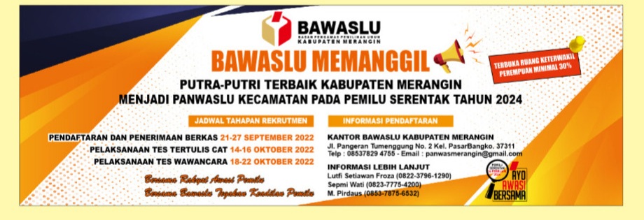 Bawaslu Kabupaten Merangin- Dalam rangka pembentukan Panitia Pengawas Pemilihan Umum Kecamatan pada Pemilihan Umum tahun 2024, Kelompok Kerja Pembentukan Panitia Pengawas Pemilihan Kecamatan Bawaslu Kabupaten Merangin, berdasarkan Peraturan Badan Pengawas Pemilu Republik Indonesia Nomor 8 tahun 2019 Perubahan kedua atas Peraturan Badan Pengawas Pemilihan Umum Nomor 19 Tahun 2017 tentang Pembentukan, Pemberhentian, dan Penggantian Antar Waktu Badan Pengawas Pemilihan Umum Provinsi, Badan Pengawas Pemilihan Umum Kabupaten/Kota, Panitia Pengawas Pemilihan Umum Kecamatan, Panitia Pengawas Pemilihan Umum Kelurahan/Desa, Panitia Pengawas Pemilihan Umum Luar Negeri, dan Pengawas Tempat Pemungutan Suara, atas kewenangan yang diberikan oleh Undang – Undang Nomor 7 Tahun 2017 tentang Pemilihan Umum membuka kesempatan bagi masyarakat Kabupaten Merangin yang memenuhi syarat untuk mendaftarkan diri sebagai calon anggota Panitia Pengawas Pemilihan Umum Kecamatan.