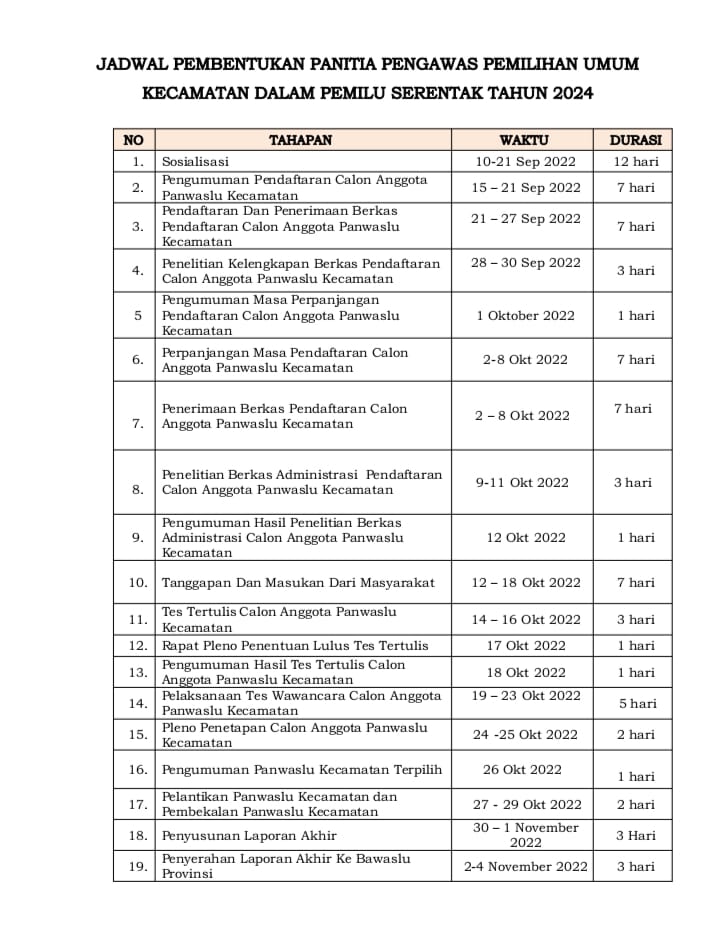 BERIKUT PERUBAHAN JADWAL PEMBENTUKAN PANITIA PENGAWAS PEMILIHAN UMUM KECAMATAN DALAM PEMILU SERENTAK TAHUN 2024